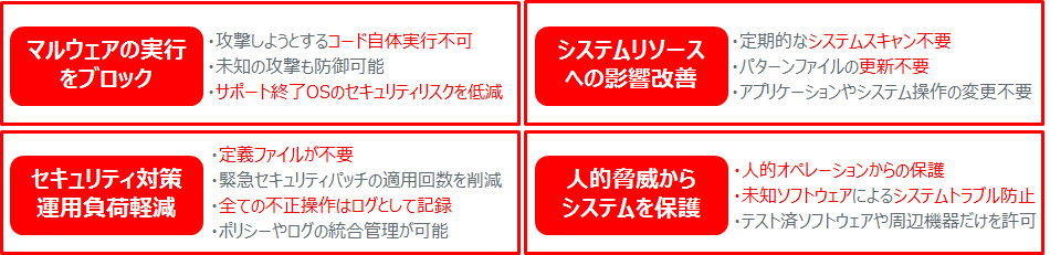 セキュリティリスク低減としての対策が可能です。スキャン負荷はほぼなく、ゼロデイ攻撃など未知の脅威のリスクも低減します。