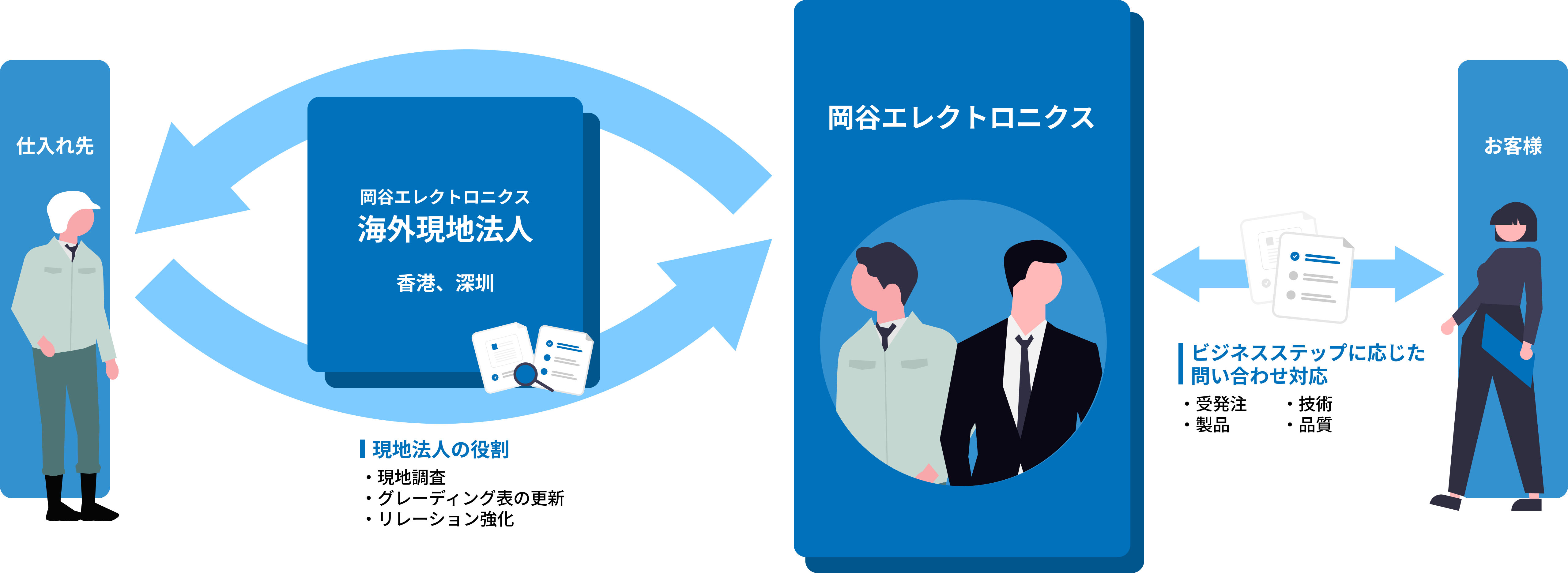 帳票作成や立ち上げ時の工場監査、量産後の不具合対応、終息時の代替提案まで、ステップに応じたサポートを提供します。